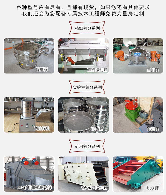 大漢廠家生產的振動篩主要針對精細篩分,實驗室篩分,礦用篩分等多種不同的場景,該設備種類型號多樣,有幾百種型號可供您選擇,且都有現貨,如果您還有其他要求,我們還會為您配備專屬技術工程師免費為量身定制。