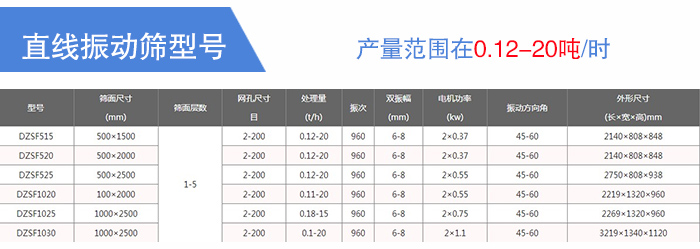 直線振動篩DZSF515、DZSF520、DZSF525、DZSF1020、DZSF1025、DZSF1030,產量范圍在0.12-20噸/時,直線振動篩的型號主要是根據用戶的篩分產量來決定的,產量越高的直線振動篩,其價格就會越高。